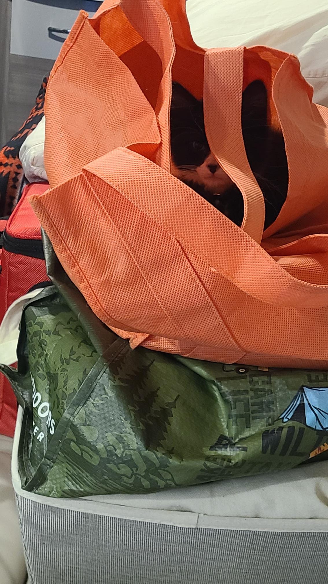 Two-month-old rescue kitten Legolas seemed to believe RV travel with two senior citizen humans and a dog was normal, everyday life. Here he is deciding our “picnic basket” bag of paper goods and plastic utensils is the perfect hangout.